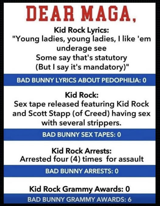 You may, but you posted the meme. It’s also wrong about Kid Rock’s arrests, he was arrested 4 times but the charges were never relaeased so someone is lying about assaults.